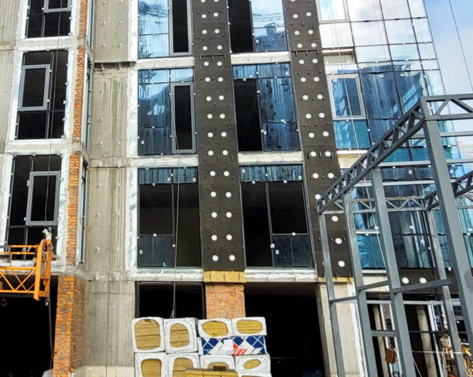 The final stages of insulating the building with non-combustible mineral wool, attaching protective geomembranes, and installing profiles for the ventilated facade with ceramic granite are underway.