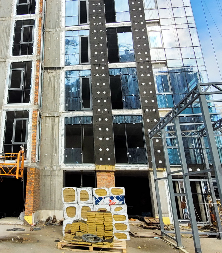 Work is underway for insulating the building with non-combustible mineral wool, attaching protective geomembranes, and installing profiles for the ventilated facade.