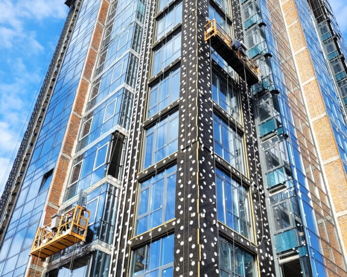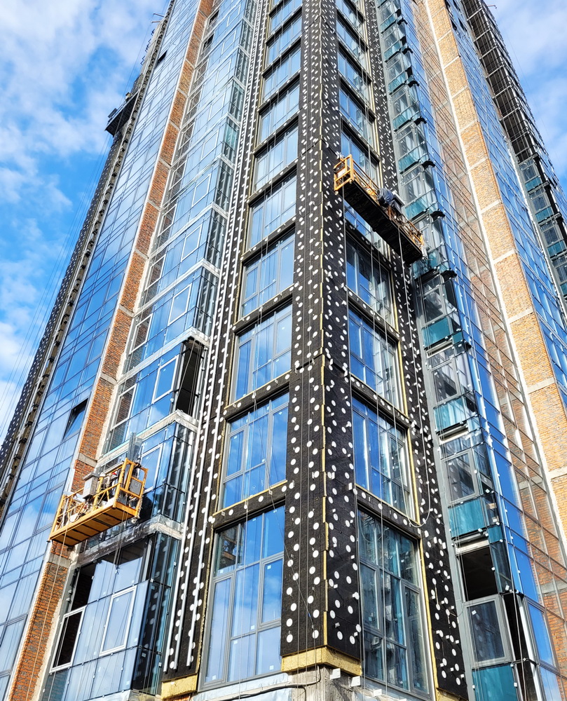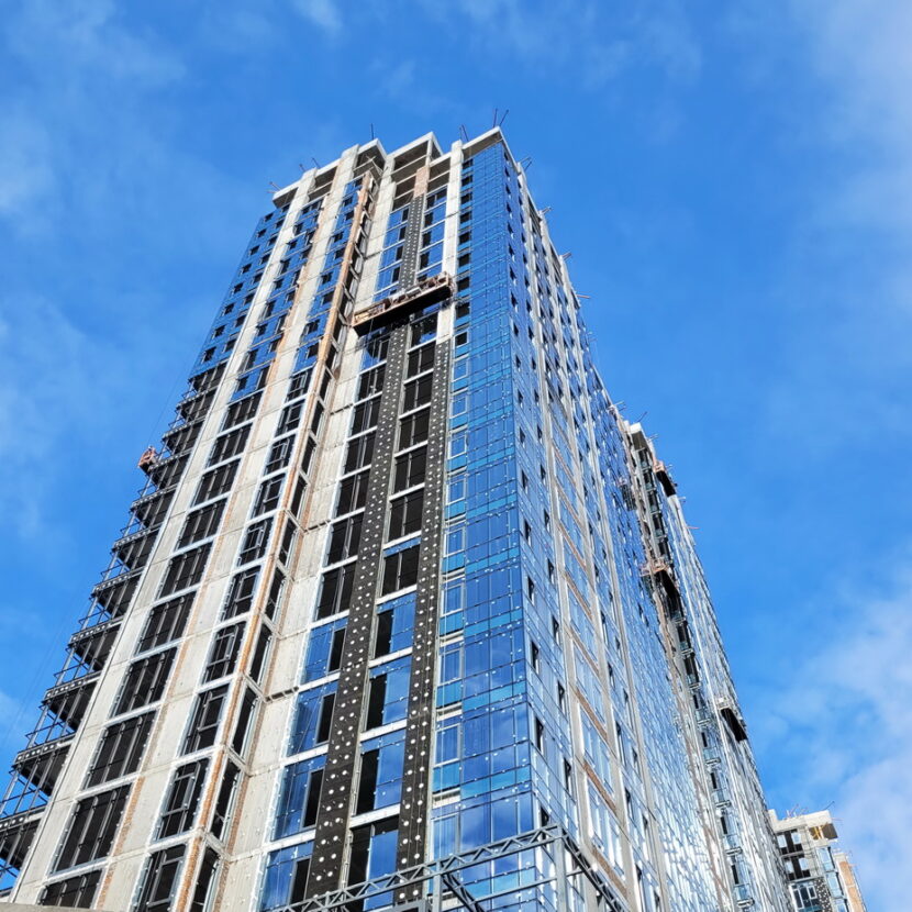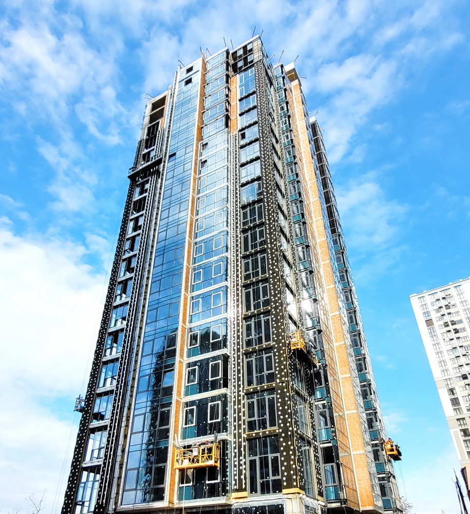 We are completing the installation of aluminum window glazing, as well as the fitting of window and door structures on the upper floors of the building. Glazing is in progress.