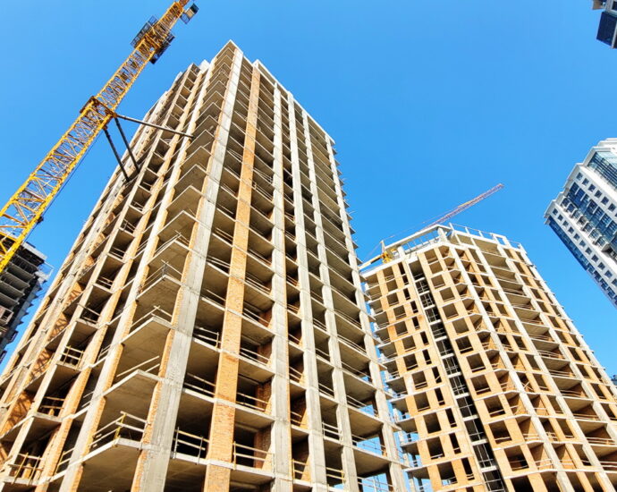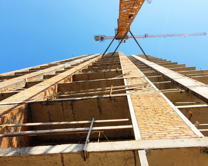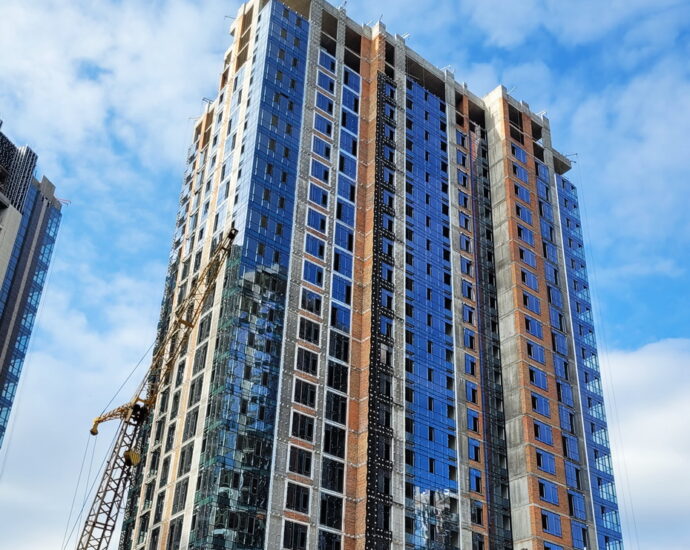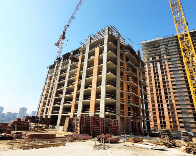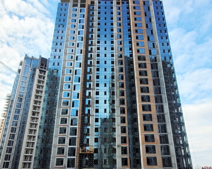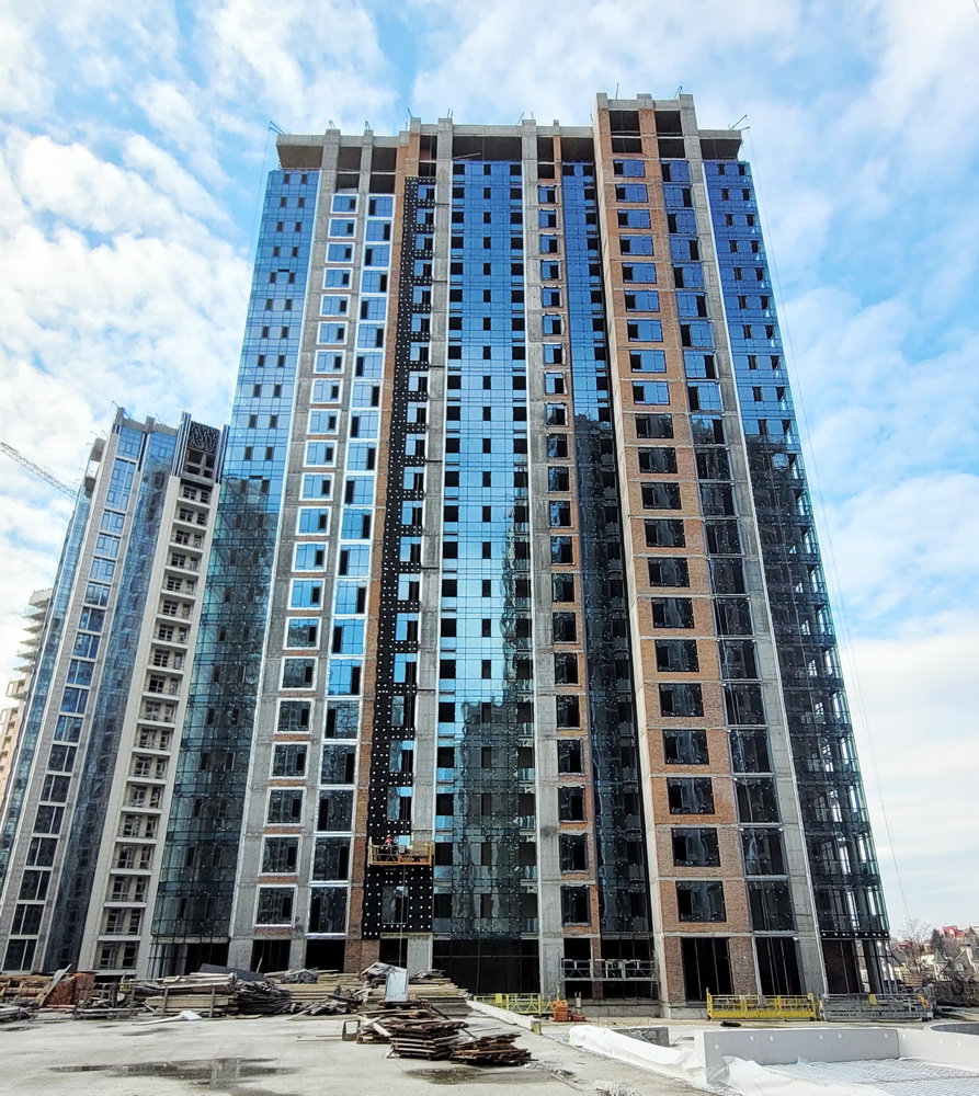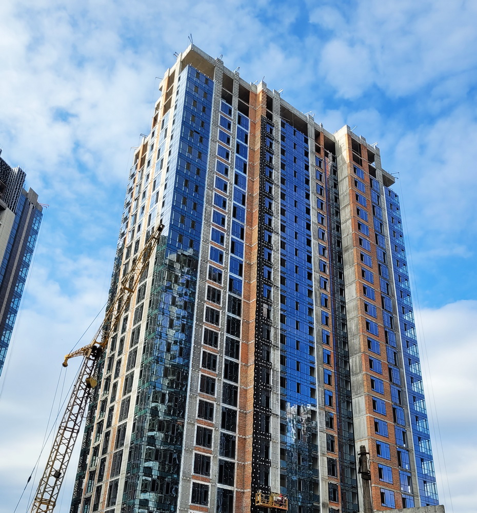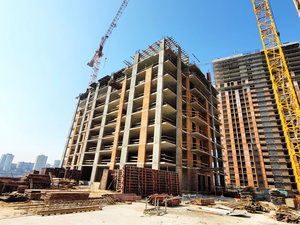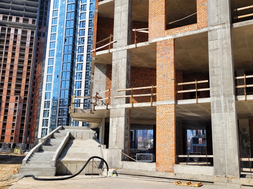 We continue the construction of the monolithic frame of the building. The construction of the 9th floor is complete. Currently, we are working on the vertical reinforced concrete structures for the 10th floor.
