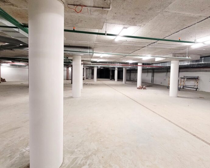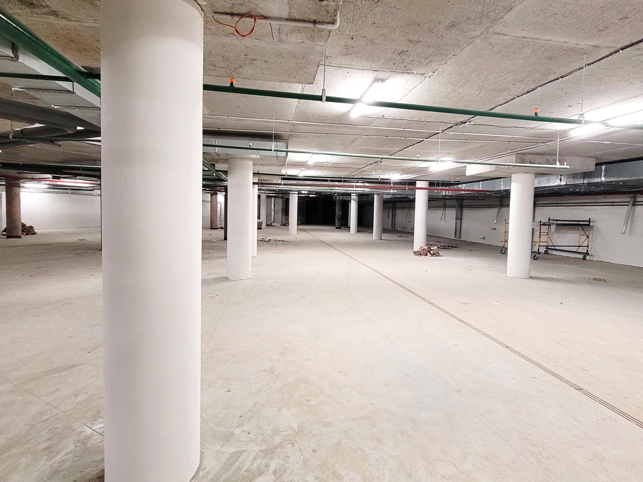 – In the underground parking, industrial concrete flooring has been finalized. The installation of ventilation and heating systems is ongoing.