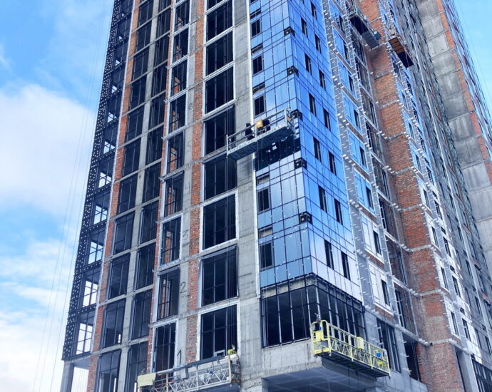 ✅ Installing aluminum window glazing and window and door structures on the facade from the 14th to the 24th floors.