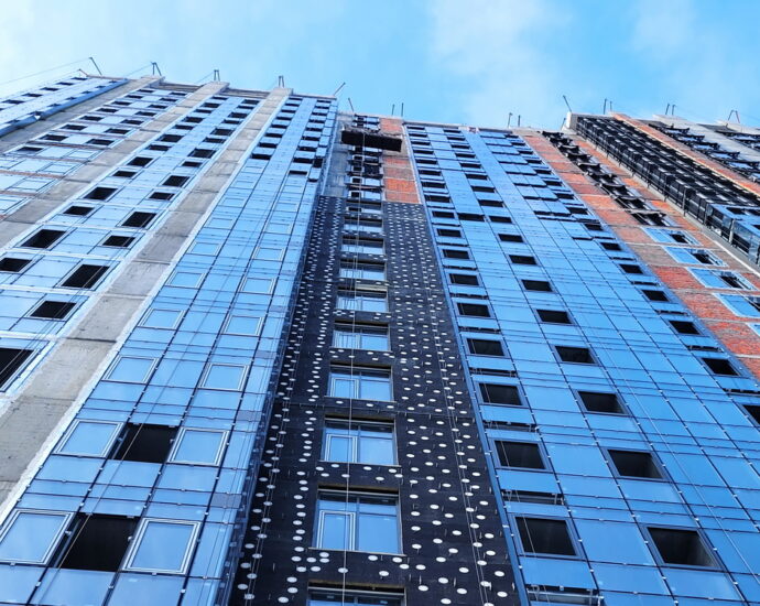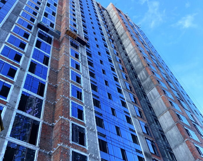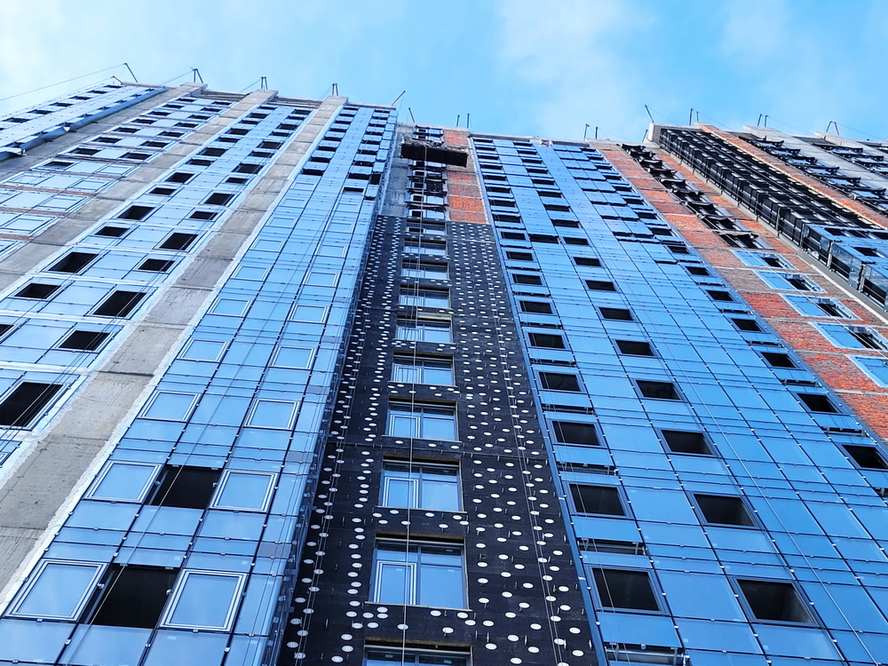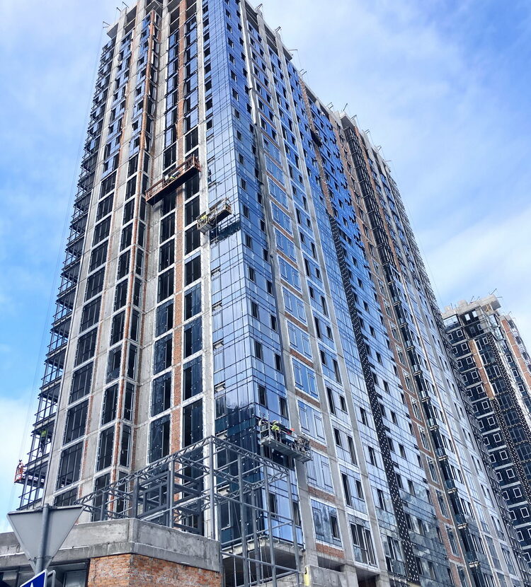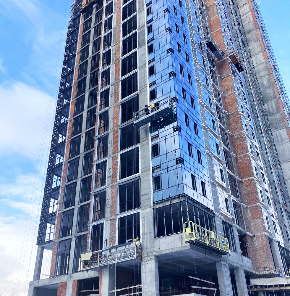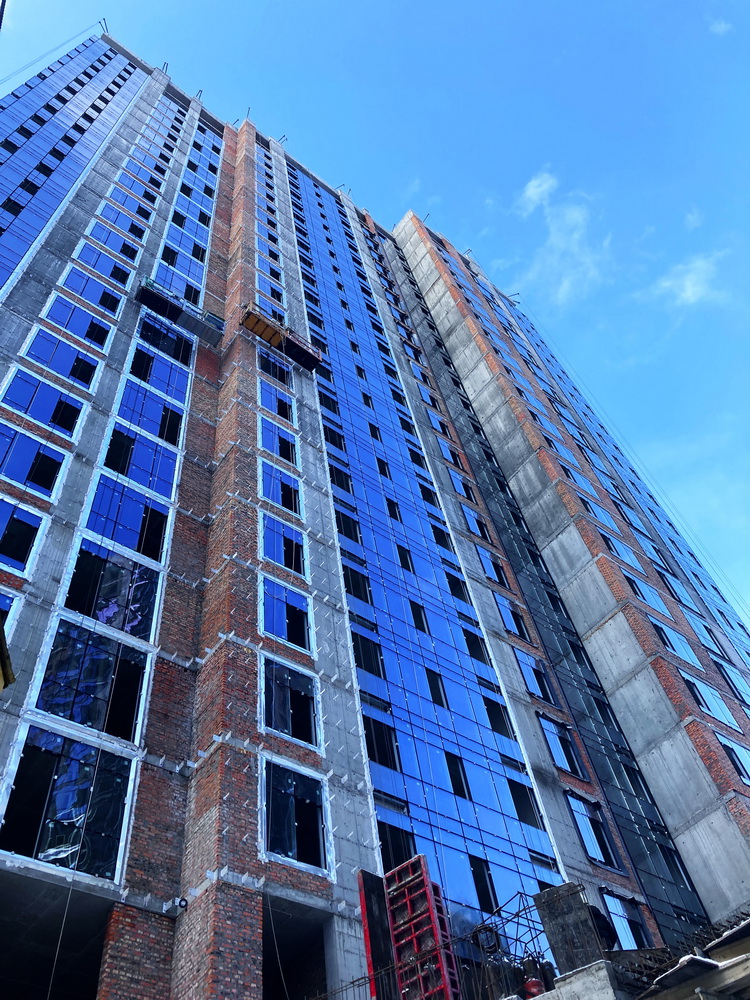 ✅ Installation of aluminum window frames, glazing, and installation of window and door structures on the upper floors of the building is almost complete.