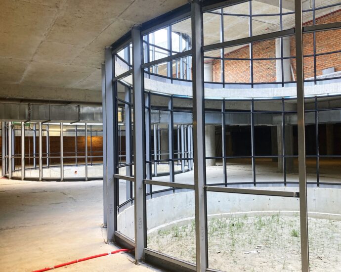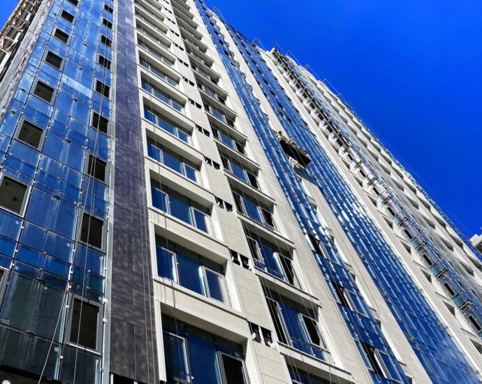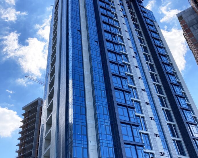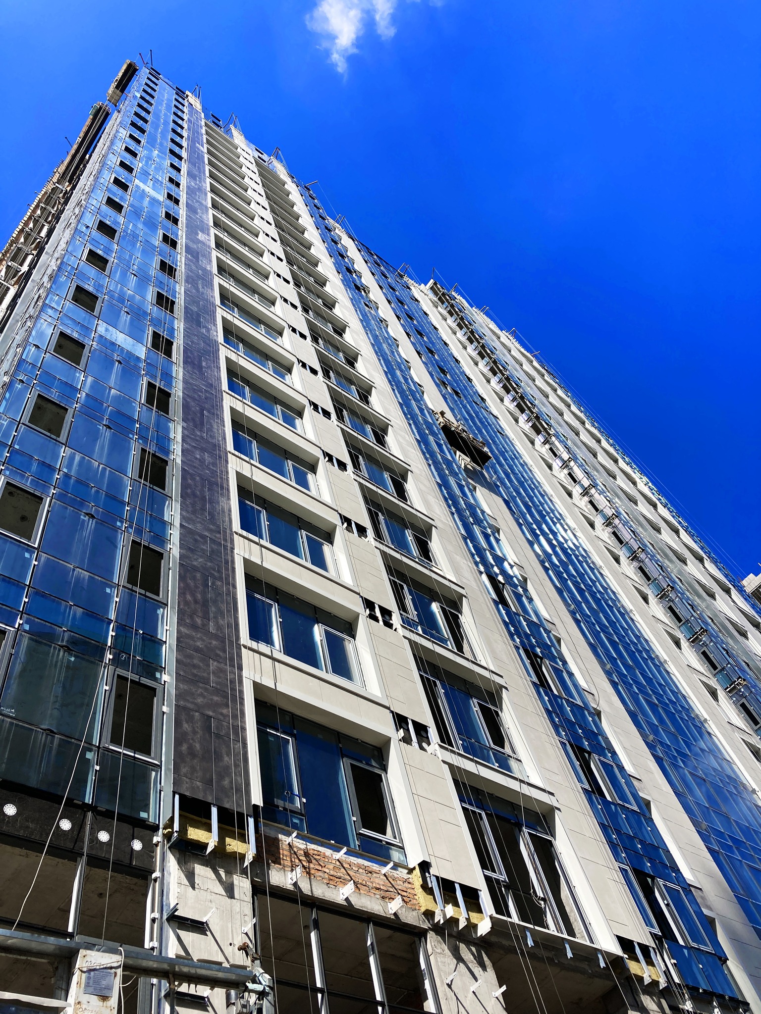 - The installation of aluminum window glazing and facade construction is nearing completion.