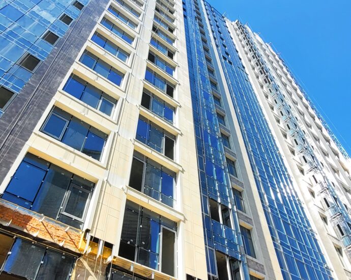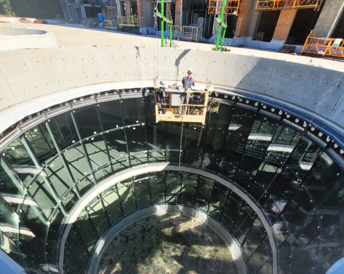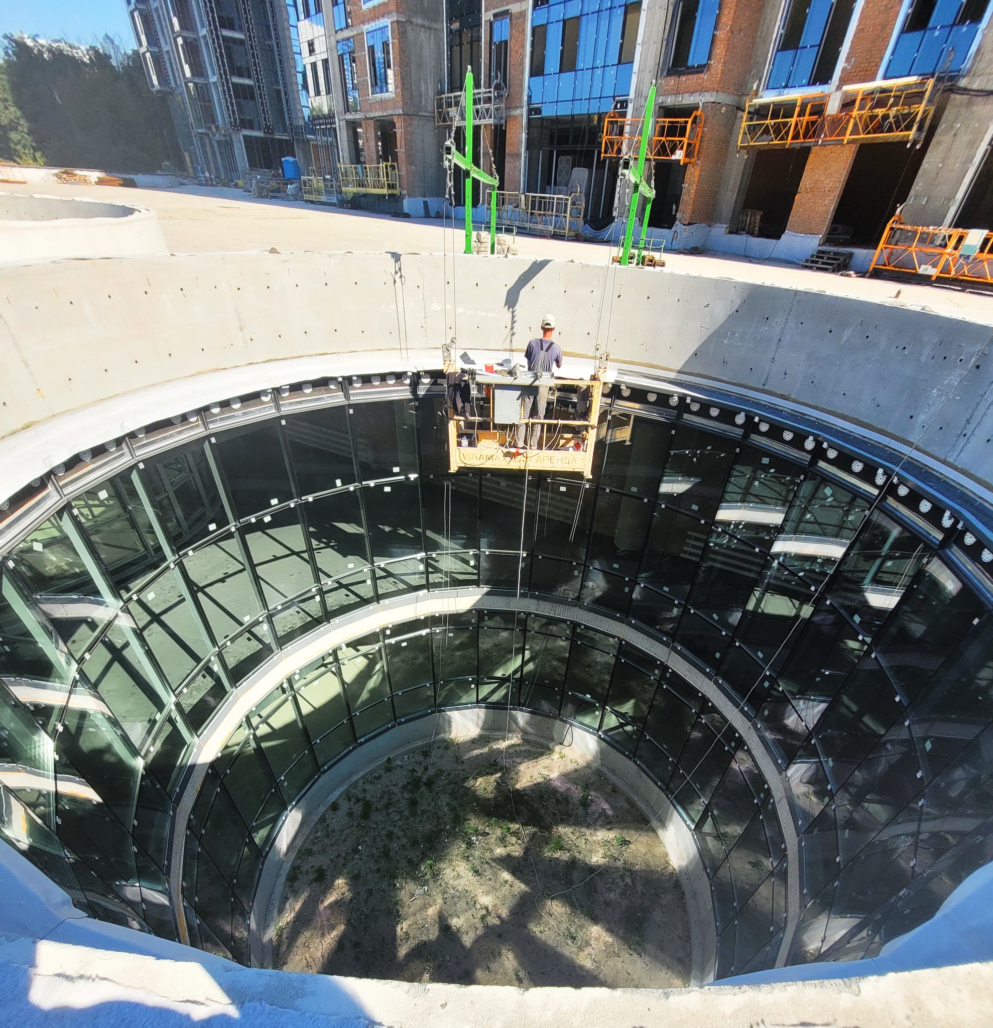 - Finalizing the installation of aluminum window glazing and facade structure glazing.