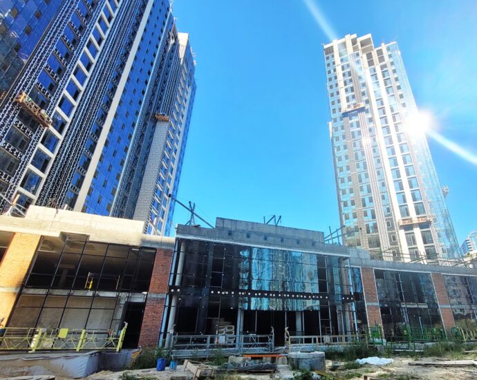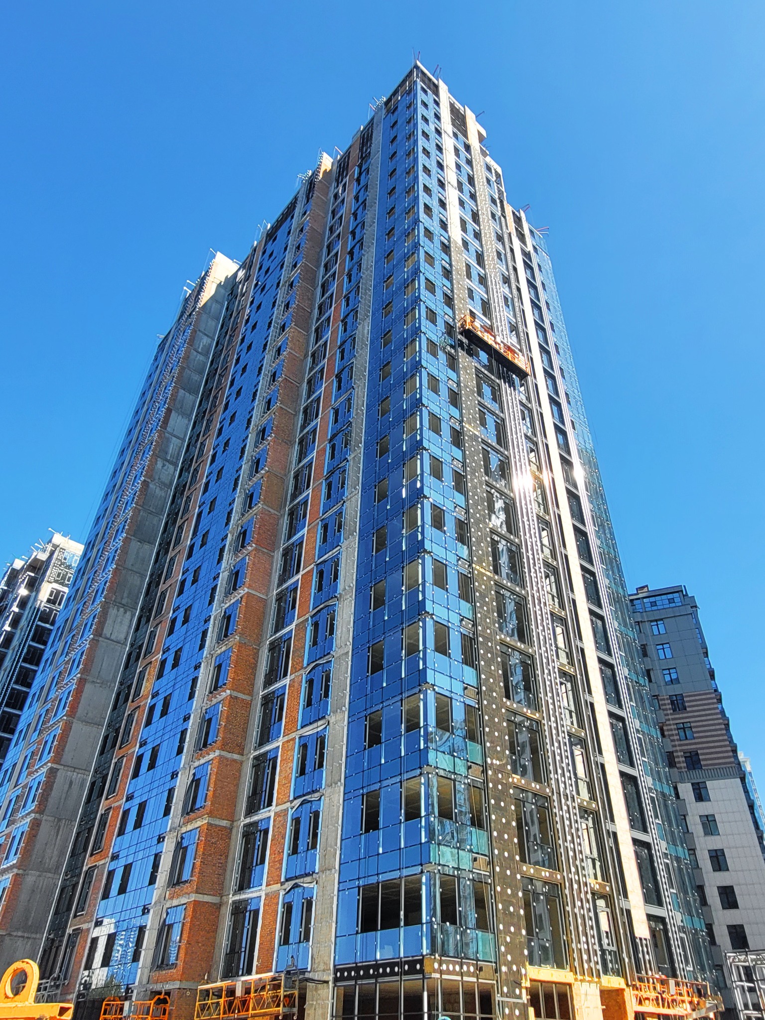 - Almost completed glazing of the facade of a two-story commercial building connecting buildings 2 and 3 in the stylobate part of the underground parking, where live trees will grow and extend into the above-ground recreational area.
