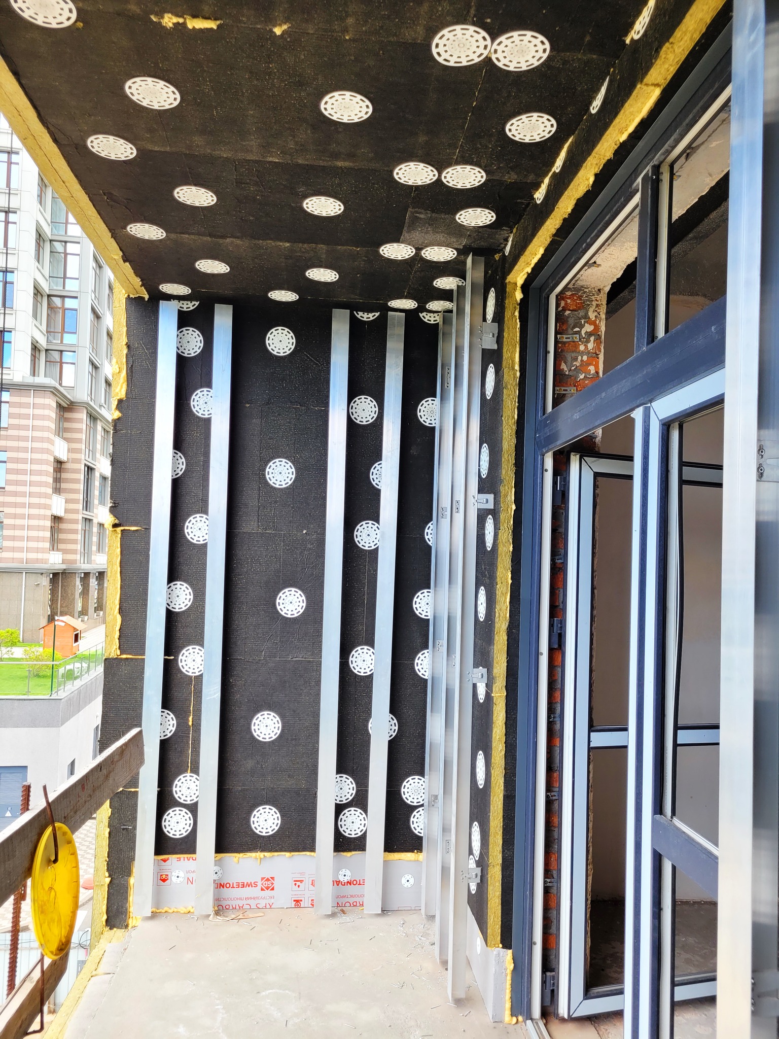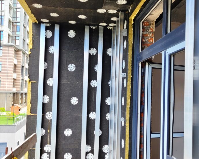 - Ongoing insulation of the building with mineral wool, fastening of protective geomembrane, and installation of ventilated facade.