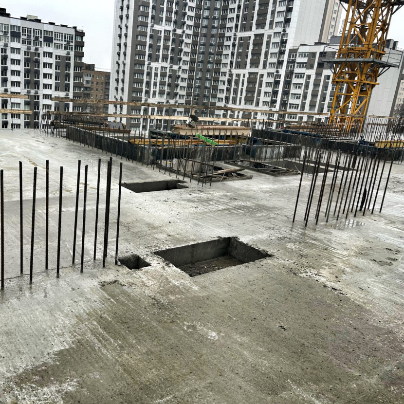- 8 поверх – готова підлога, тривають роботи по залиттю бетонних колон та з встановлення арматури для залиття бетонного каркаса.