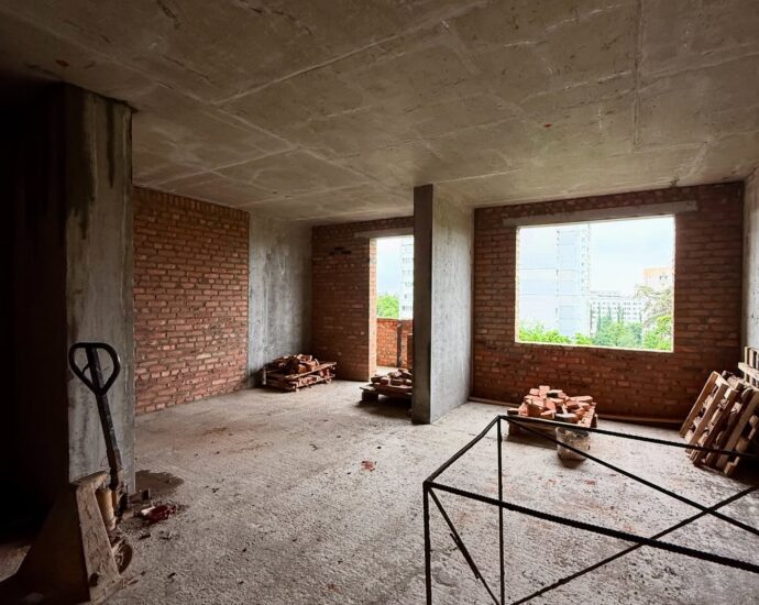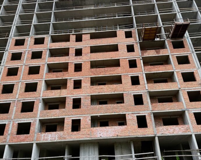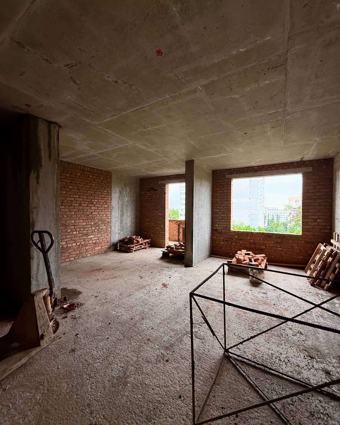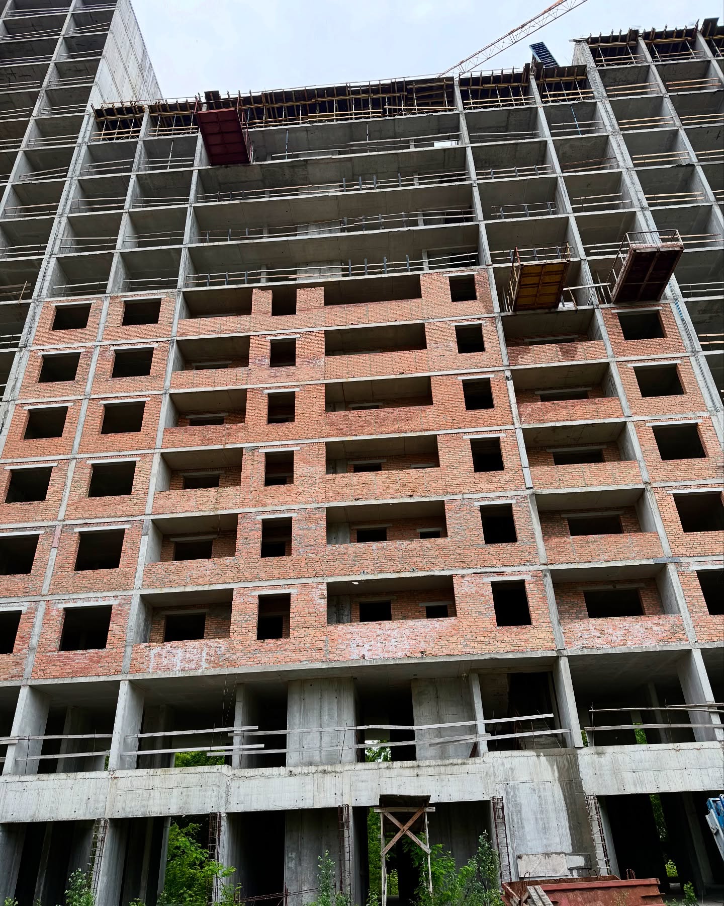 - Паралельно в цій секції тривають внутрішні роботи з викладки стін цеглою, вже готові 8 поверхів.