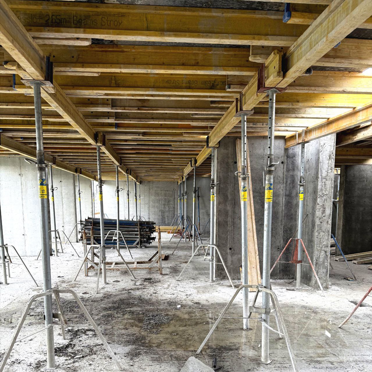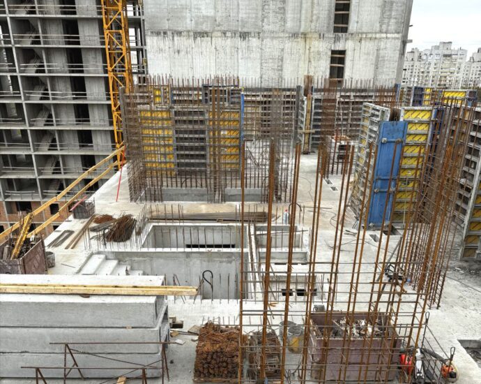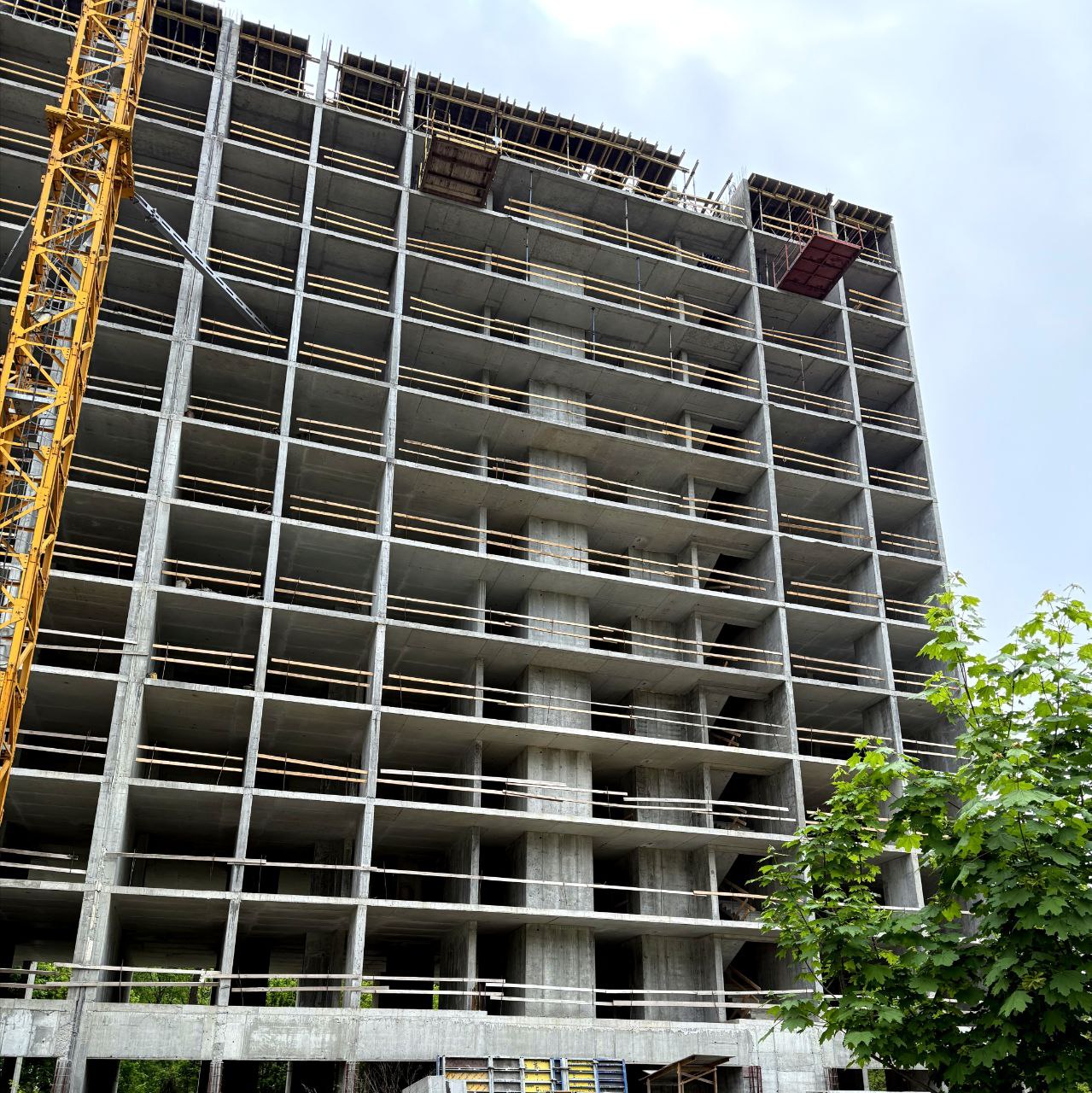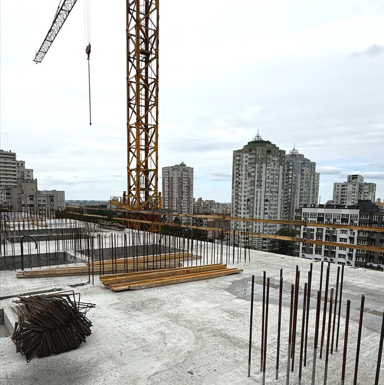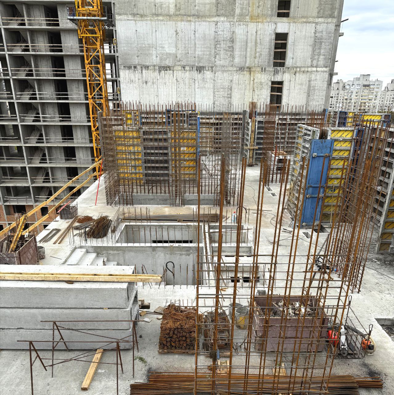 - 1 секція – монолітний каркас будівлі зведено до 13 поверху. На 13 поверсі ведуться роботи з армування та монтажу опалубки для заливання залізобетонного перекриття.