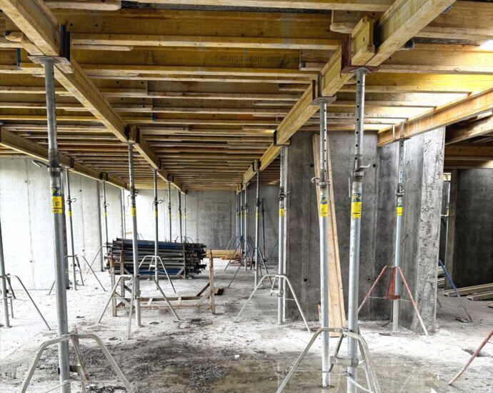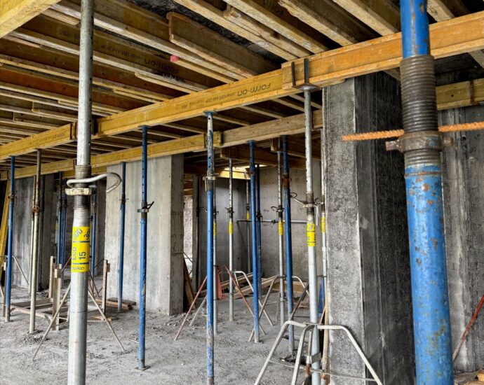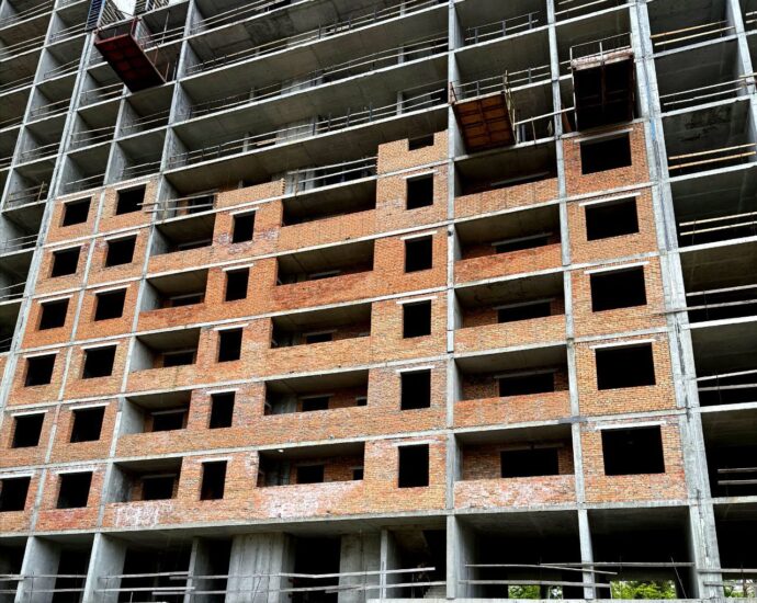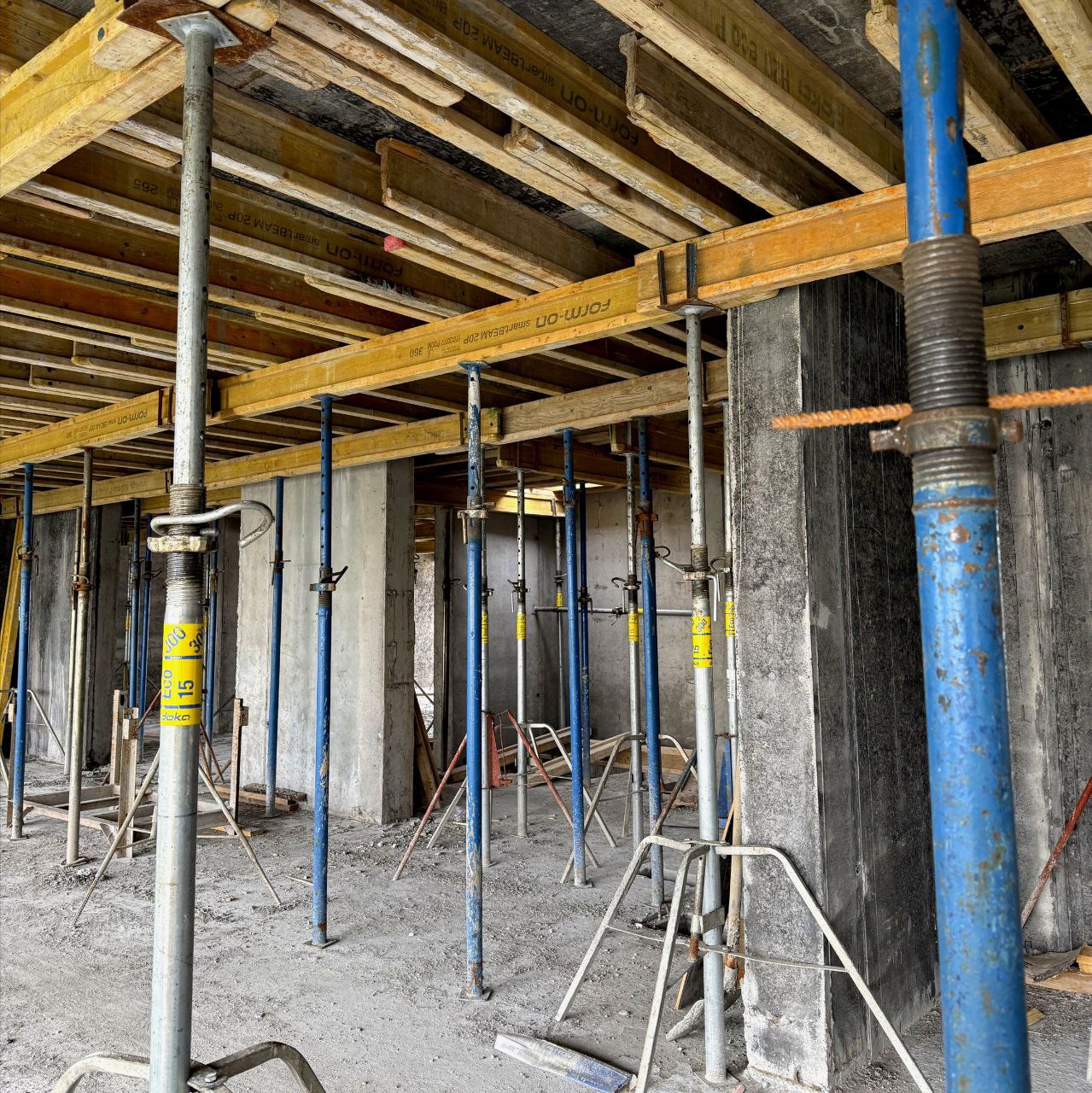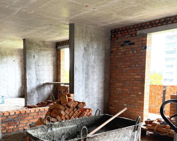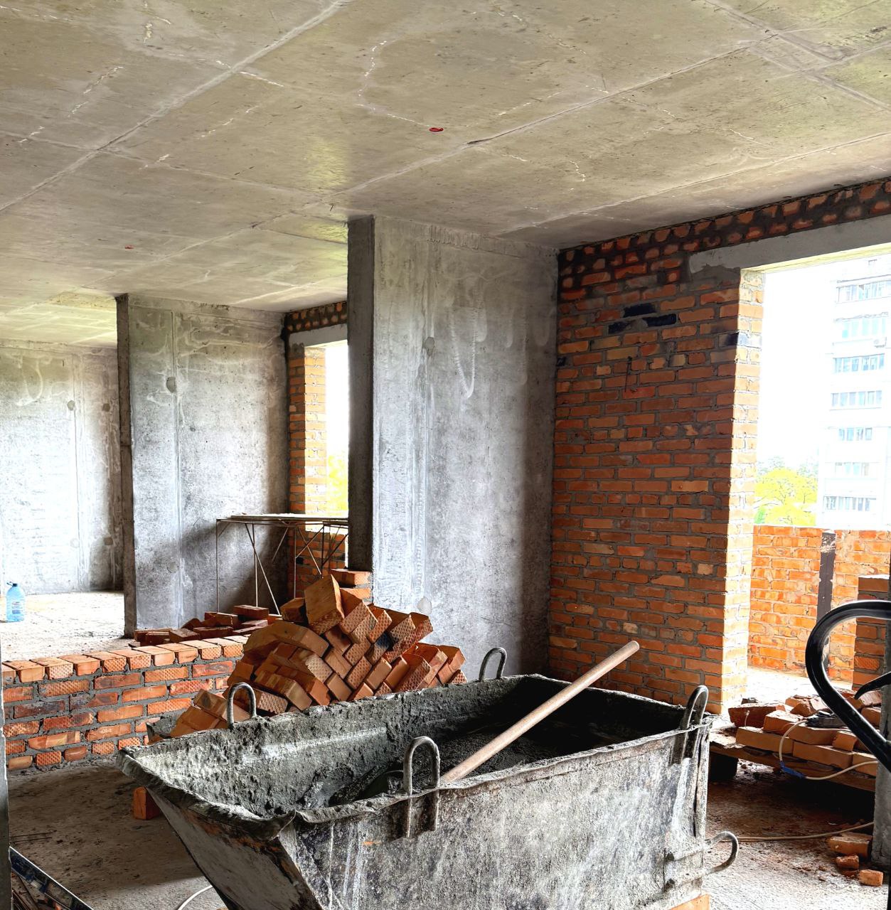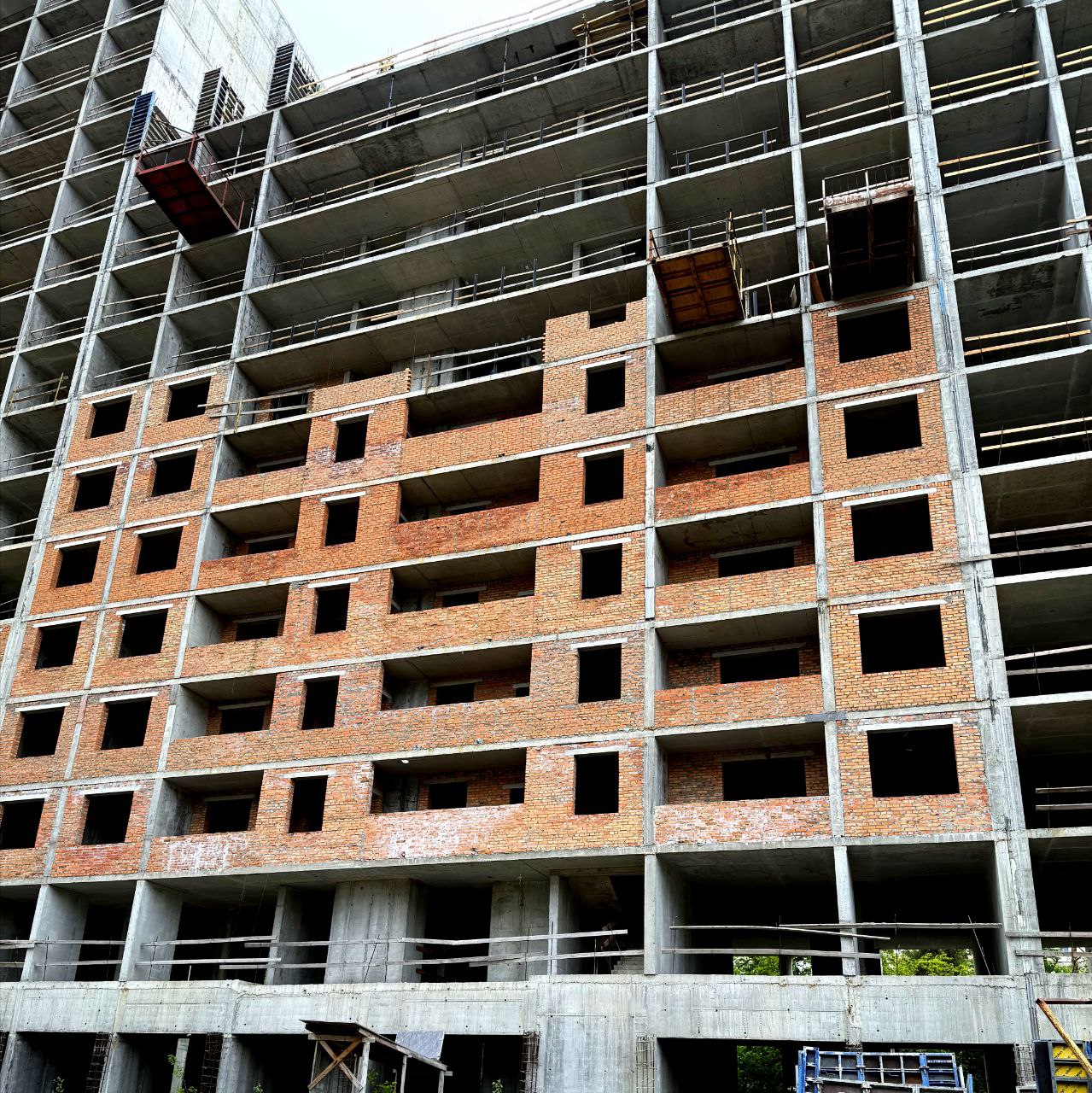 - Окрім цього, у цій секції виконуються внутрішні роботи з мурування стін цеглою. Наразі роботи активно ведуться на 8 поверсі.