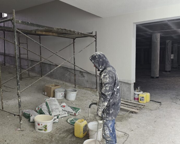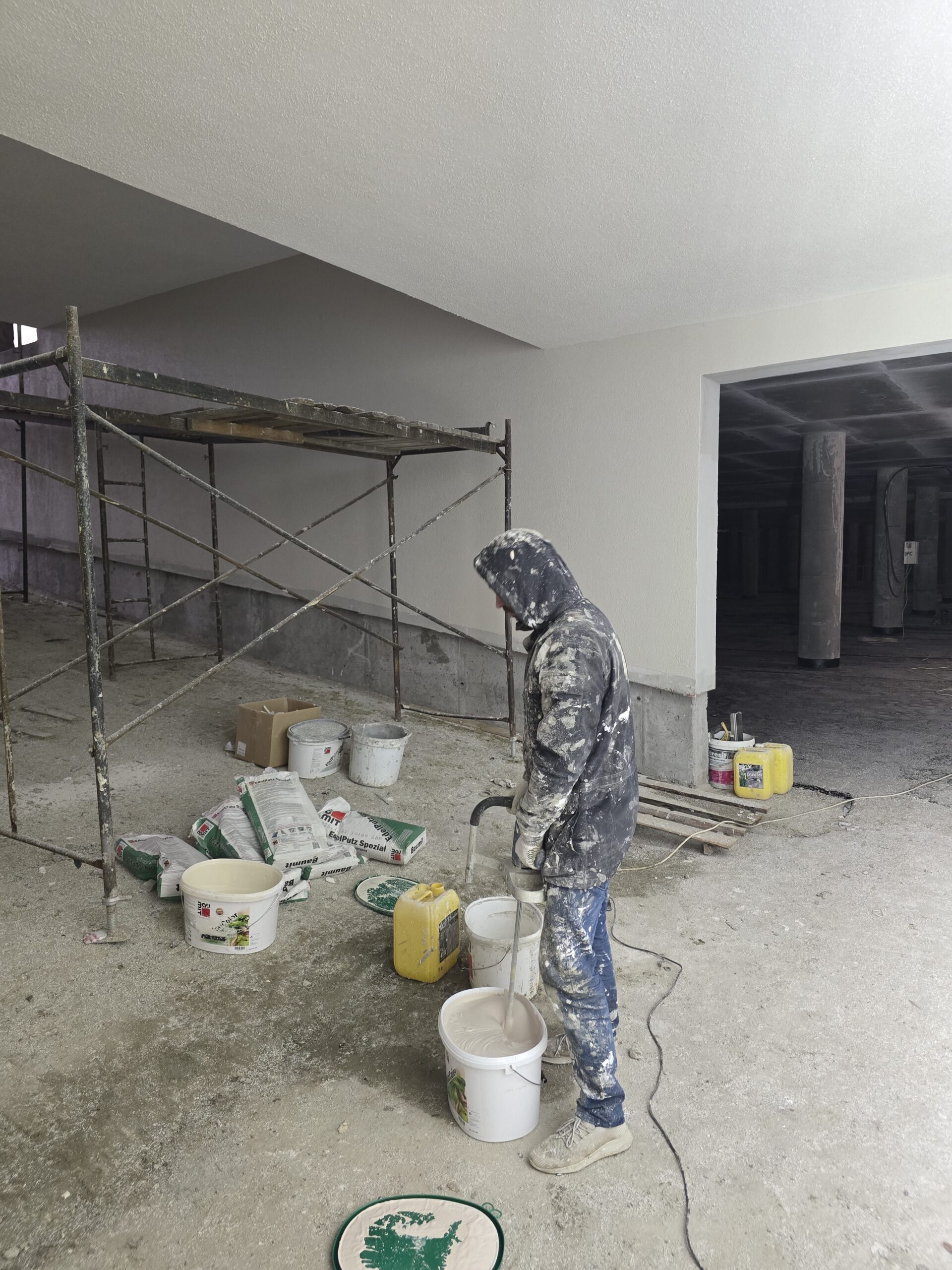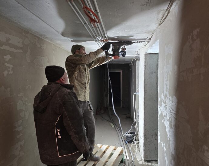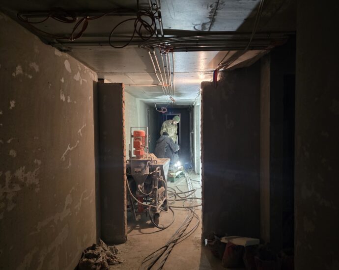 Завершується улаштування стяжок у квартирах та місцях загального користування.