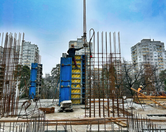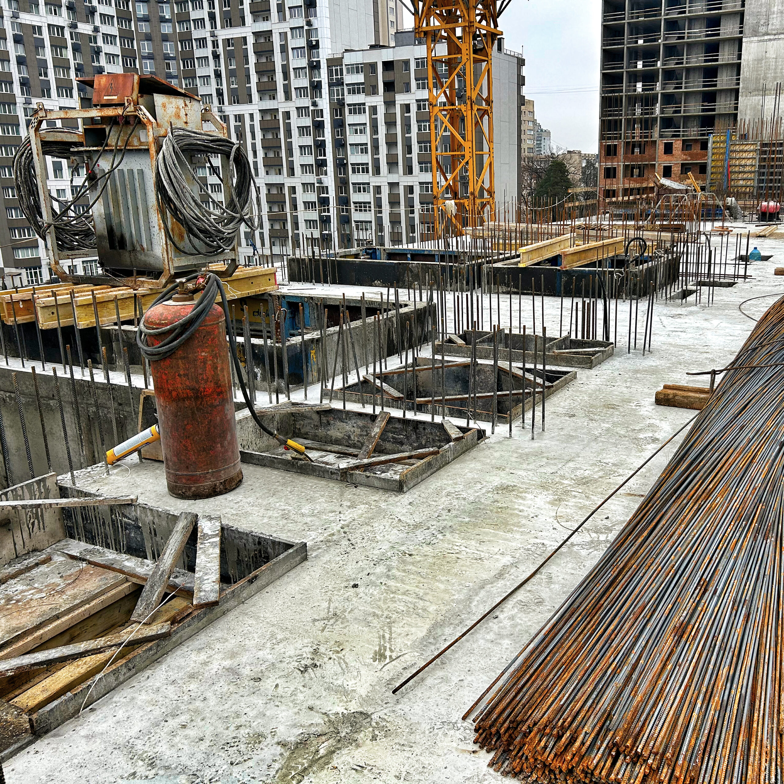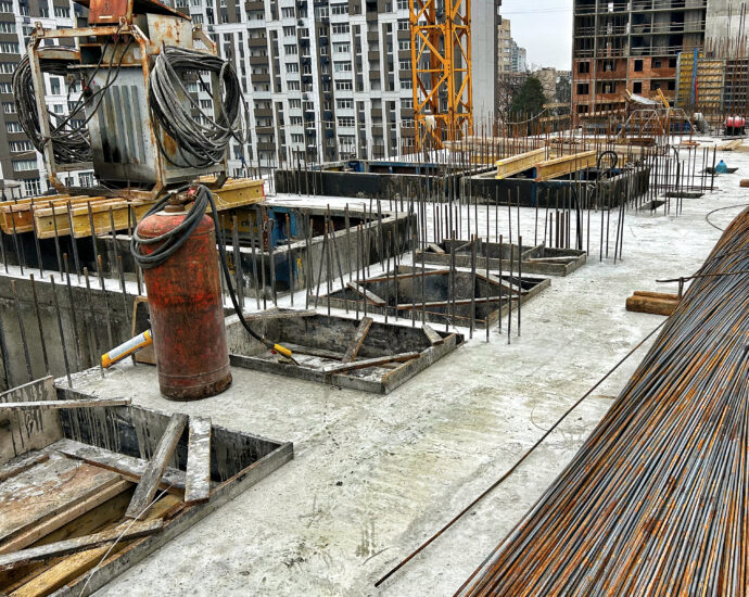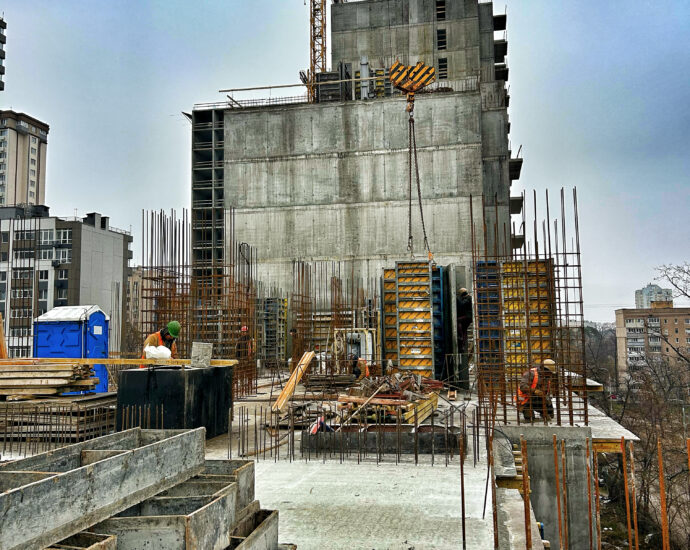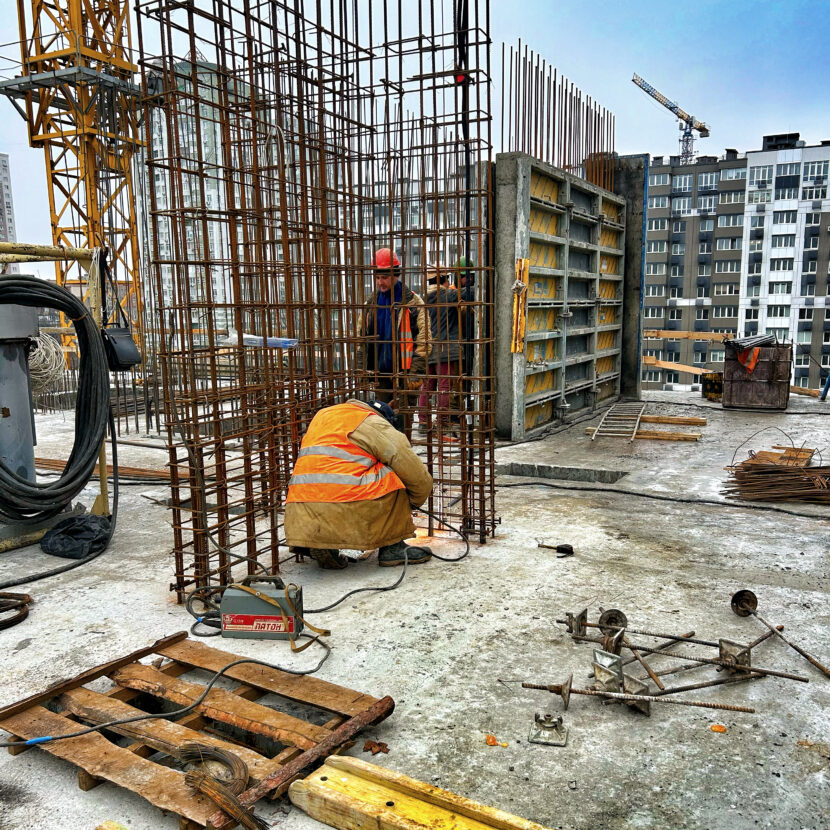 - 3 та 4 секції: Повністю готові бетонний каркас та стеля 6 поверху обох секцій. Тривають роботи з улаштування арматури та опалубки для залиття бетонного каркаса на 7 поверсі.